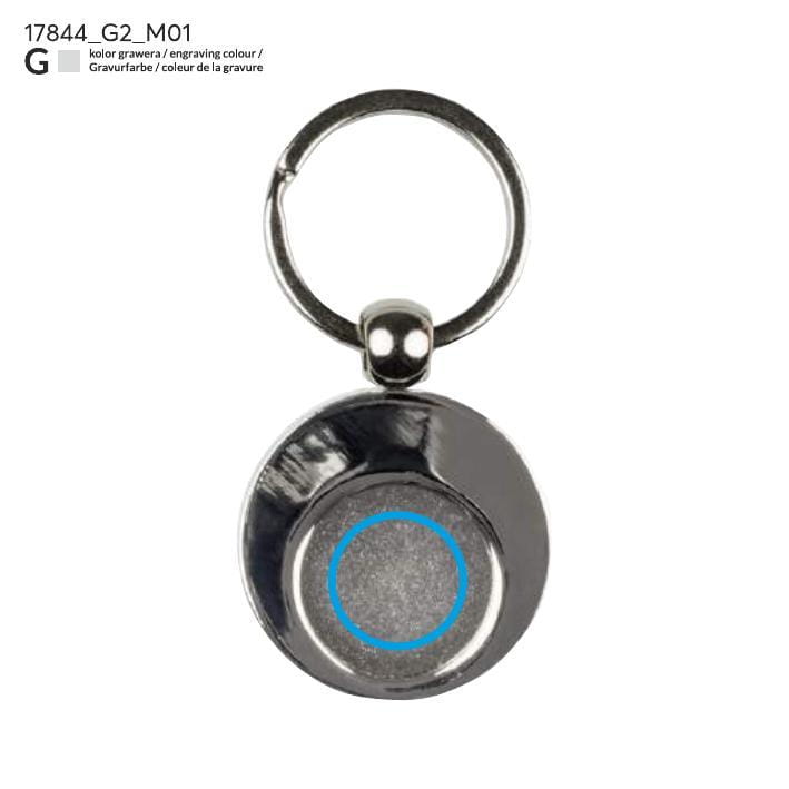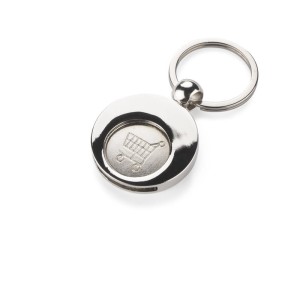 Metal keychain with a token, featuring a chrome-plated surface. The token fits shopping carts. Engraving is done on the token. The token has a diameter of 1 Euro.