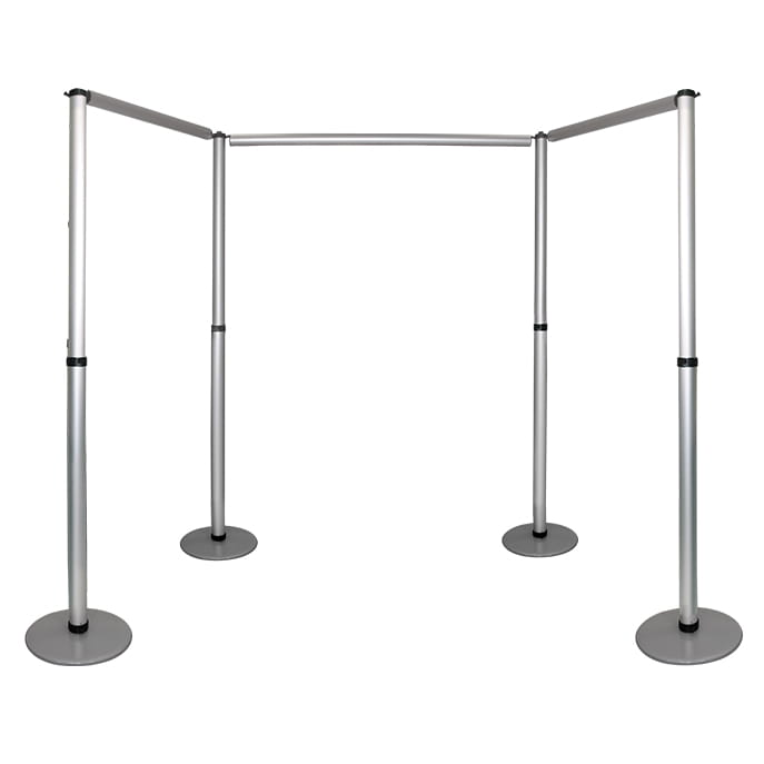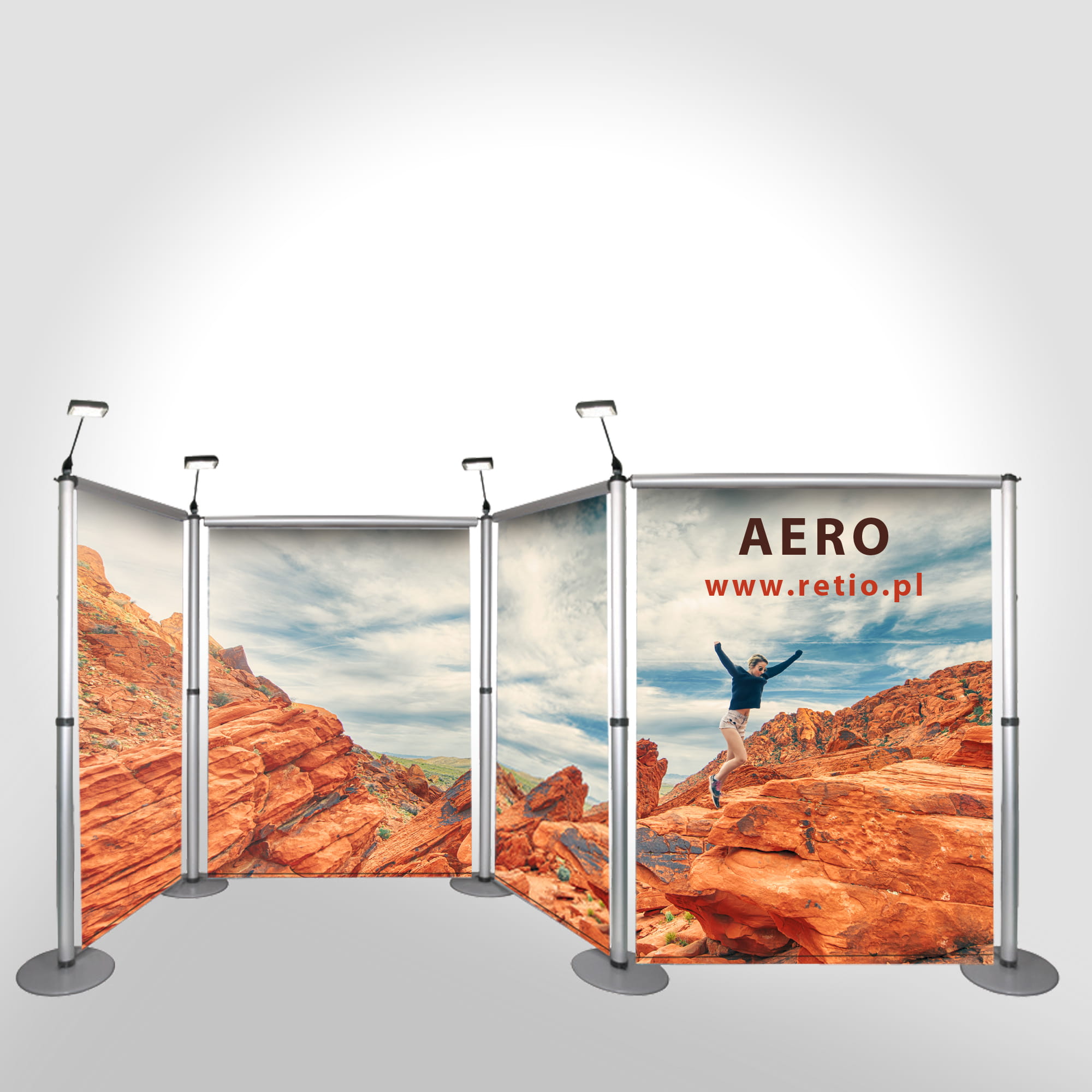 The AERO 3m set includes: 3 cartridges 1500 mm wide (each with printed graphics) + 4 telescopic poles + 4 round bases + transport bags.