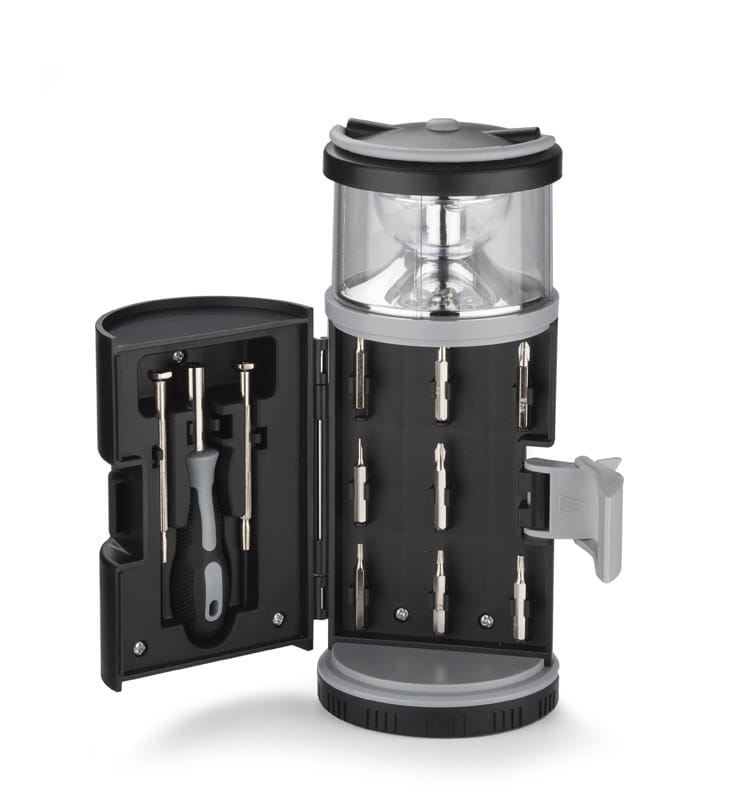 The BARTO tool set is a lantern-shaped set containing a screwdriver with 8 bits, 2 precision screwdrivers, and an LED lamp that serves as an interesting camping lamp. It has a handle for hanging or carrying. The lamp is powered by 3xAAA batteries. Batteries are not included.