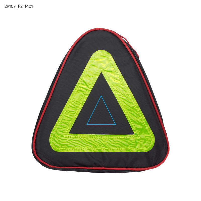 Car tool set contained in a polyester bag which, thanks to its shape, can be used as an emergency triangle. The set includes: battery charging cables, tire pressure measuring tool, screwdriver and socket wrench set, dynamo flashlight, protective gloves, knife, and rain poncho. The logo will be applied using the screen printing technique.