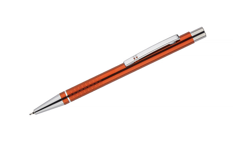 The BONITO pen is an elegant metal pen available in metallic colors with chrome finishes. Made from high-quality aluminum, the pen body is decorated with a silver ring and stripes featuring a subtly textured surface. The pen is equipped with a black semi-gel ink refill with a thickness of 0.7 mm.
