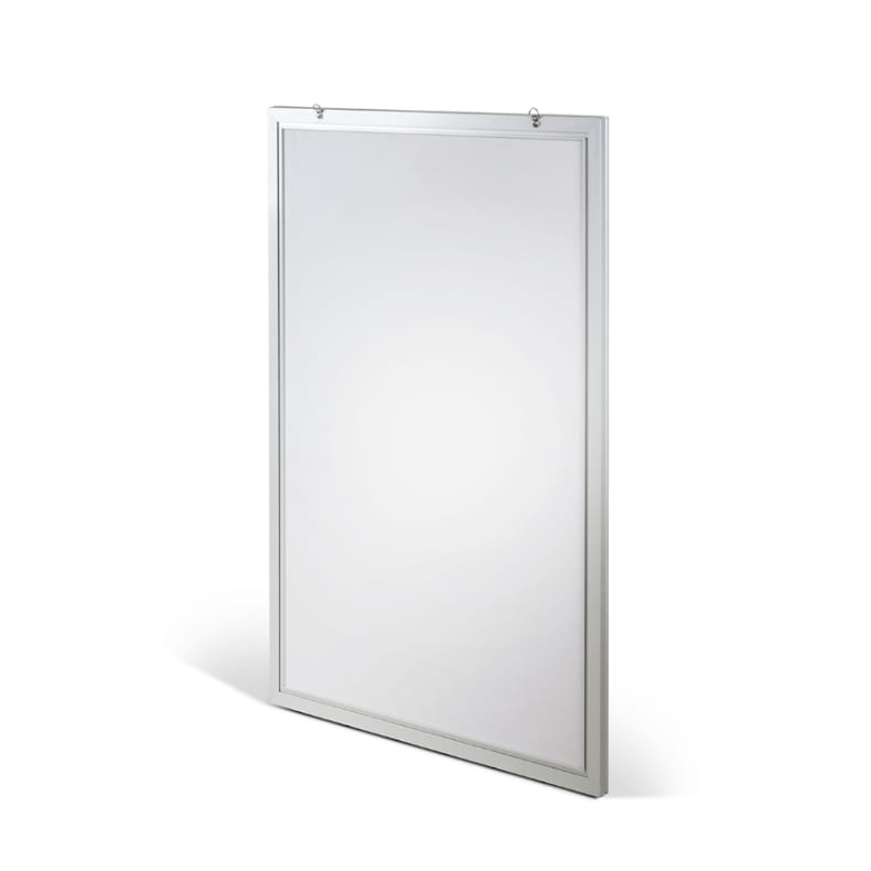The frame is made of elegant silver anodized aluminum, suitable for various types of spaces - from a shop window to a modern office interior.