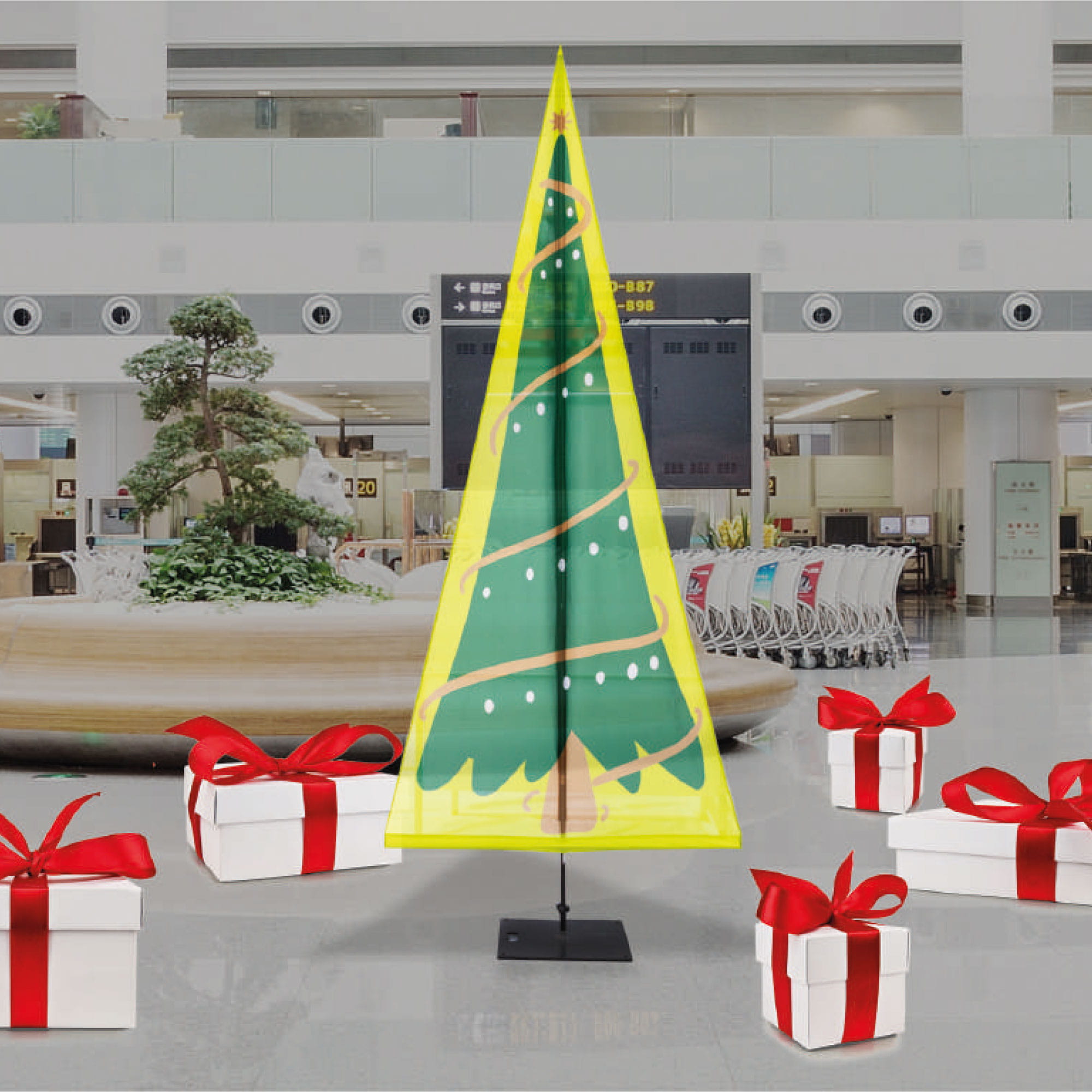 Advertising Christmas Christmas tree based on the flag structure - this is a slightly modified flagship you have on which the flagship material with printing is suspended.It is an easy and quick way to add a bit of Christmas magic in every space.