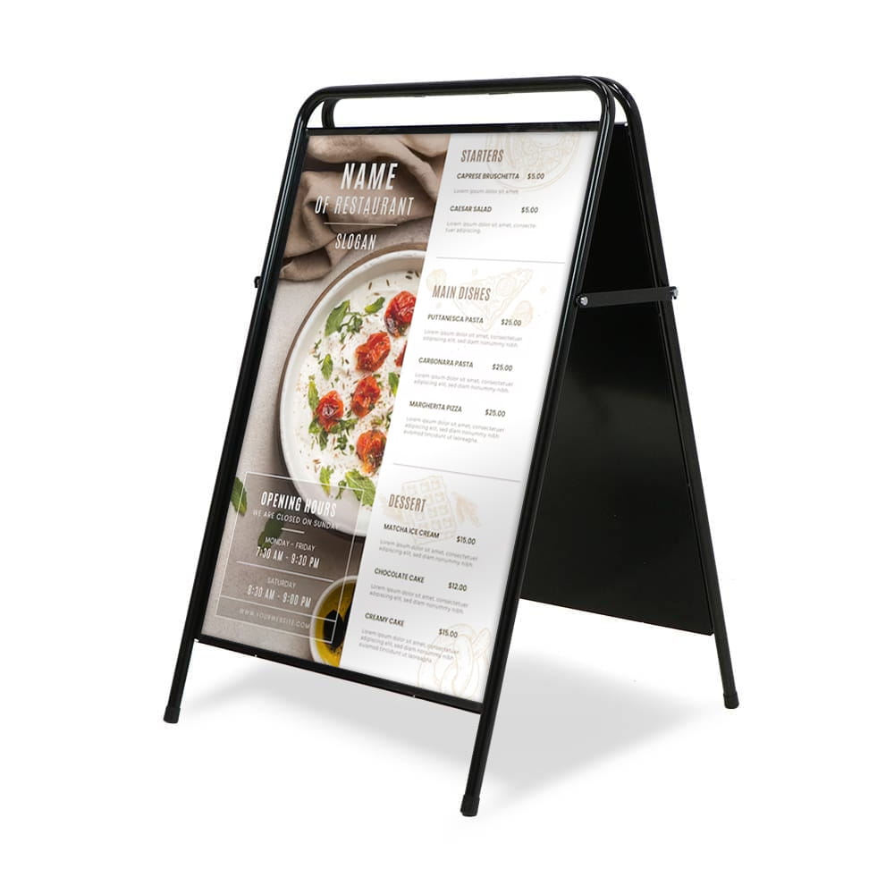 Are you missing a sturdy and stylish solution for presentation? The black steel stand ensures visibility thanks to its large frame designed for double-sided display of your company's poster or offer.