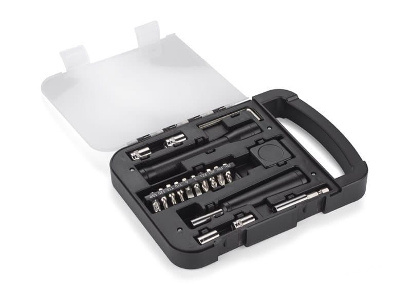 FIXO is a tool set in a practical case. Inside you will find: an Allen key, flashlight, tape measure, screwdriver, ten different bits, an extension, and four socket heads 7mm, 8mm, 9mm, and 10mm.