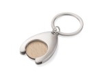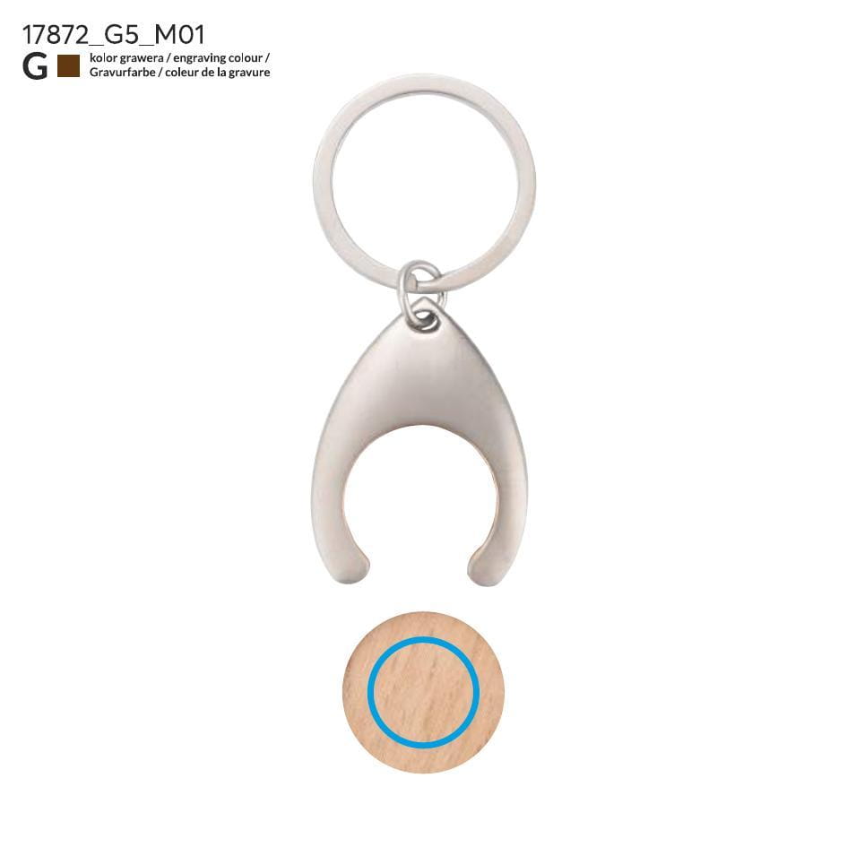 Metal keychain with a token made from recycled furniture wood. The token fits shopping carts. Packed in a brown envelope.