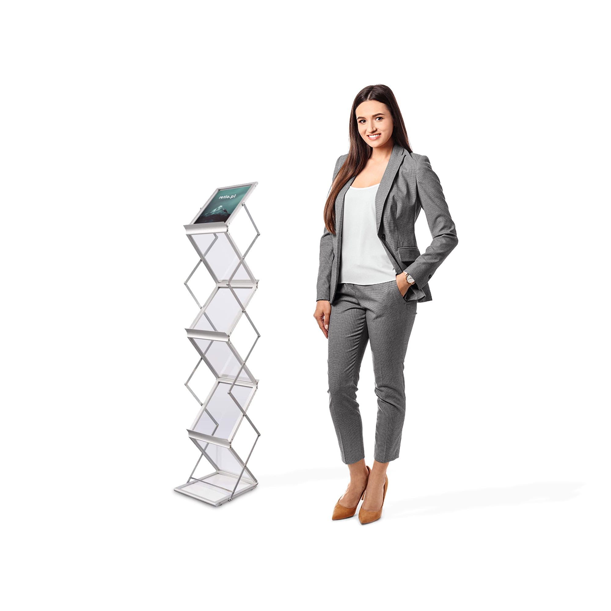 The only concern you may have is running out of POS materials. The stand's design attracts customers' attention and allows easy browsing of brochures thanks to its double-sidedness.