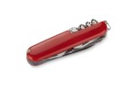 HIDI pocket knife with a red handle made of plastic. It has all the essential functions: knife, saw, fish scaler, scissors, can opener, bottle opener, screwdriver, corkscrew, awl, and leather punch.