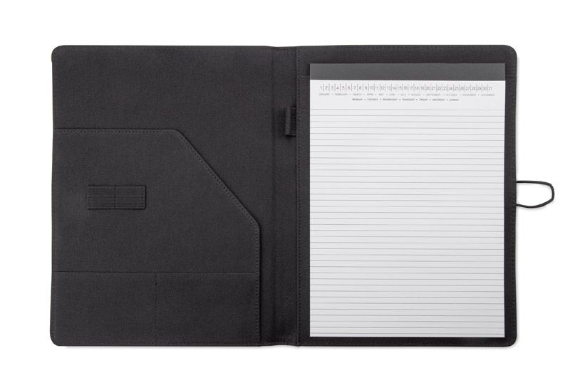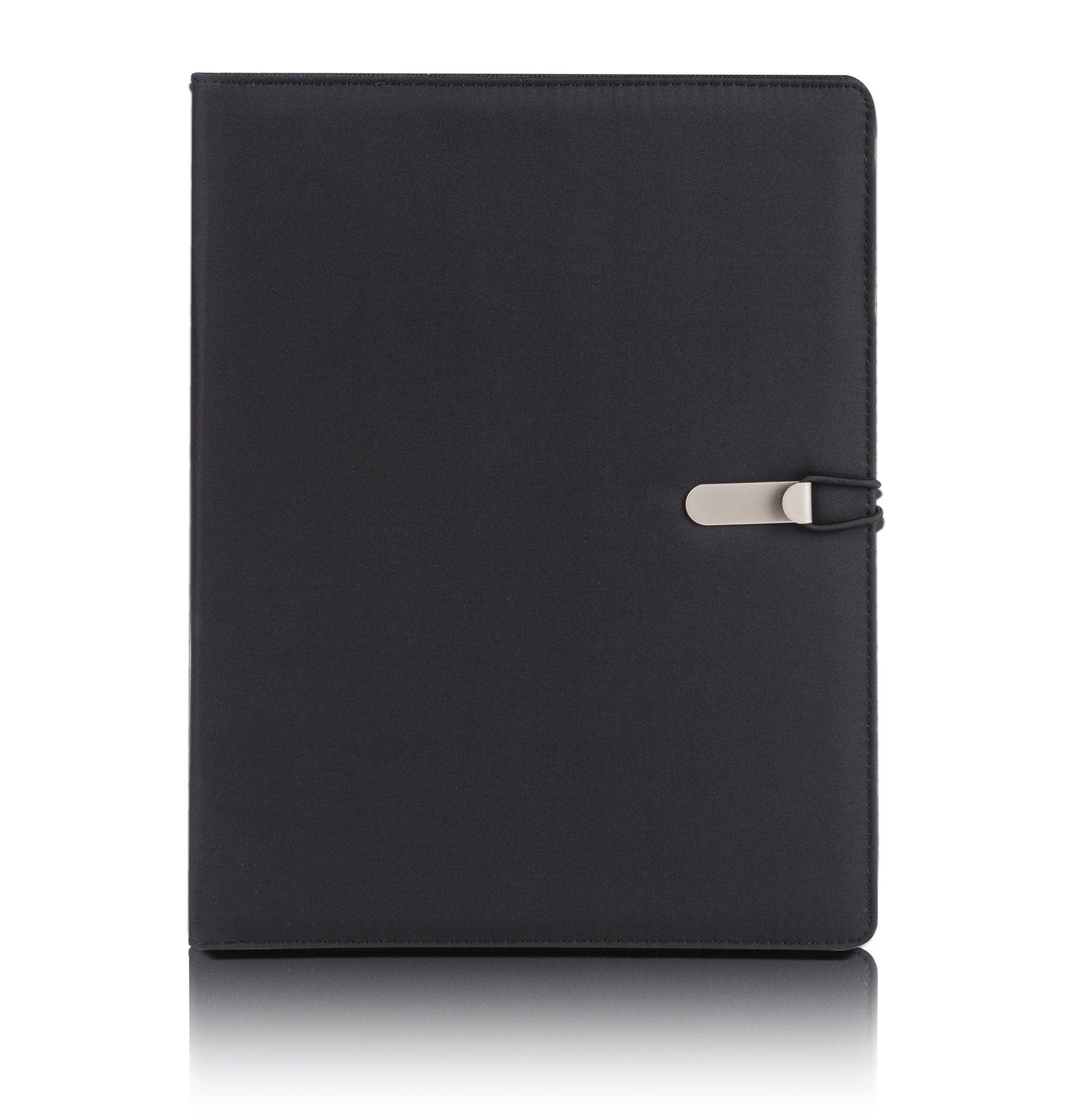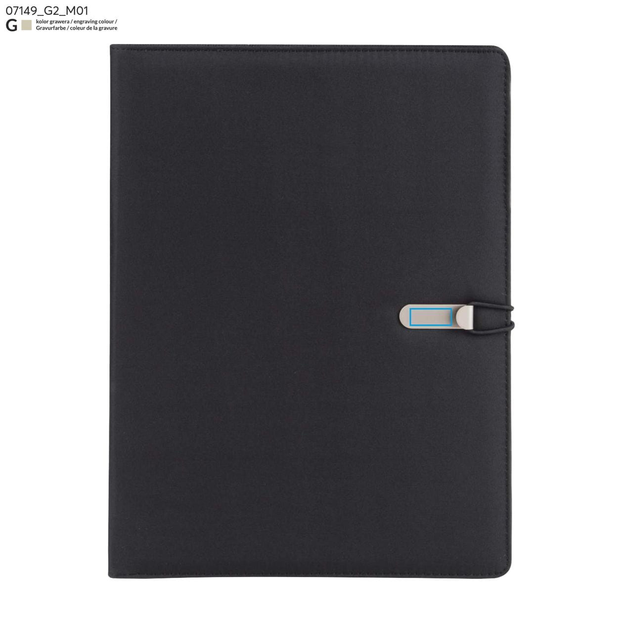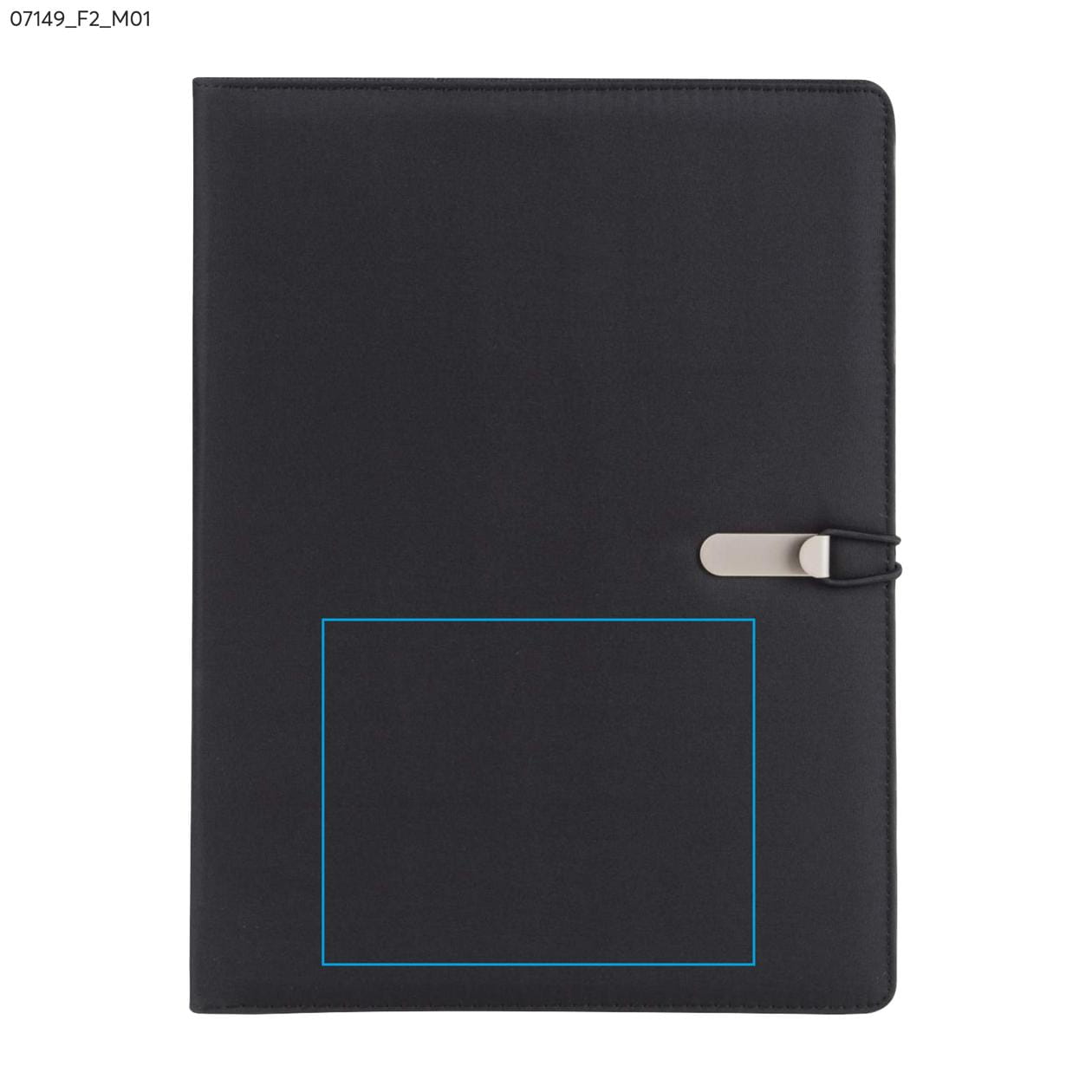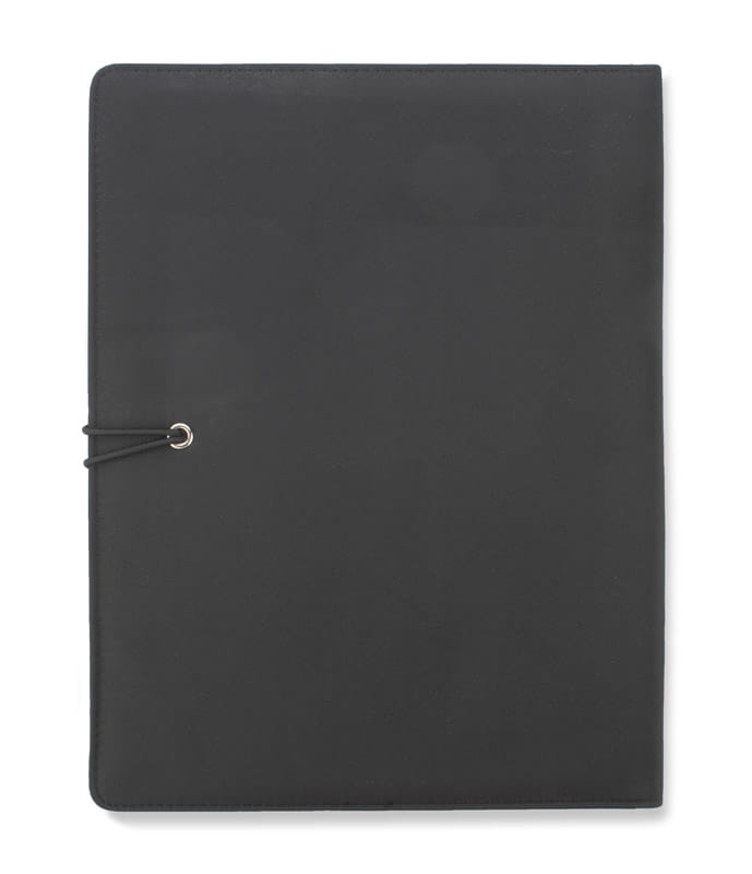 Made of high-quality microfiber and polyester, the folder is not only elegant but also durable and resistant to damage. Furthermore, the possibility to engrave a logo on the metal clasp makes it a perfect idea for a unique gift for clients or employees, strengthening the brand's visual identity. The folder is available in classic black, making it suitable for any style, and its compact dimensions make it easy to fit into a bag or backpack.