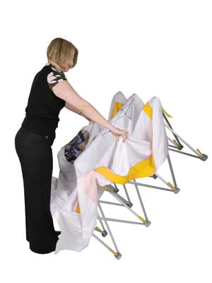 A great advantage for the exhibitor (system user) is the frame assembly that requires neither much effort nor time and that without the use of any tools. After this step, the textile graphic is mounted on the frame, which is secured with Velcro strips. This step is one-time, as it is possible to fold the carrier together with the material.