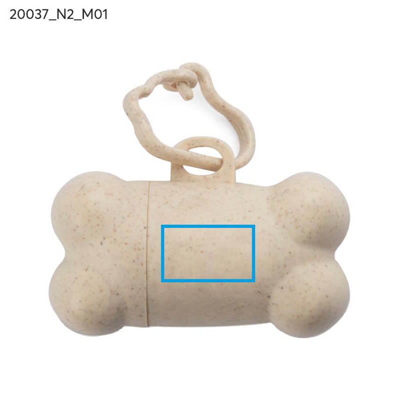 The INU dog waste bag dispenser contains 15 black bags. They are packed in a dispenser shaped like a bone. The dispenser is made from a combination of plastic and wheat straw. The dispenser can be attached with a carabiner to a leash, belt, or backpack.
