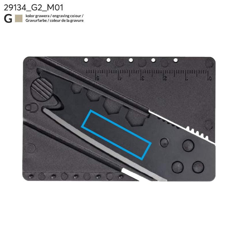 The KLINGO folding knife is a solution for situations when a knife is essential but you don't have one with you. Thanks to its dimensions and shape similar to a credit card, this gadget fits into a wallet, so it will always be at hand. The thoughtful design allows the blade to be folded in seconds. Functions: ruler, knife, keys (4 sizes), can opener, wire cutter.