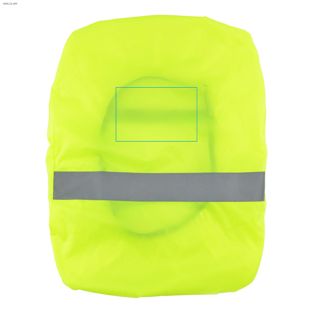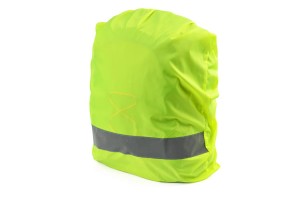 Waterproof backpack cover with a silver reflective stripe. It has two fasteners at the back to prevent the cover from slipping off the backpack. The logo can be applied using screen printing.