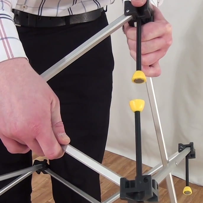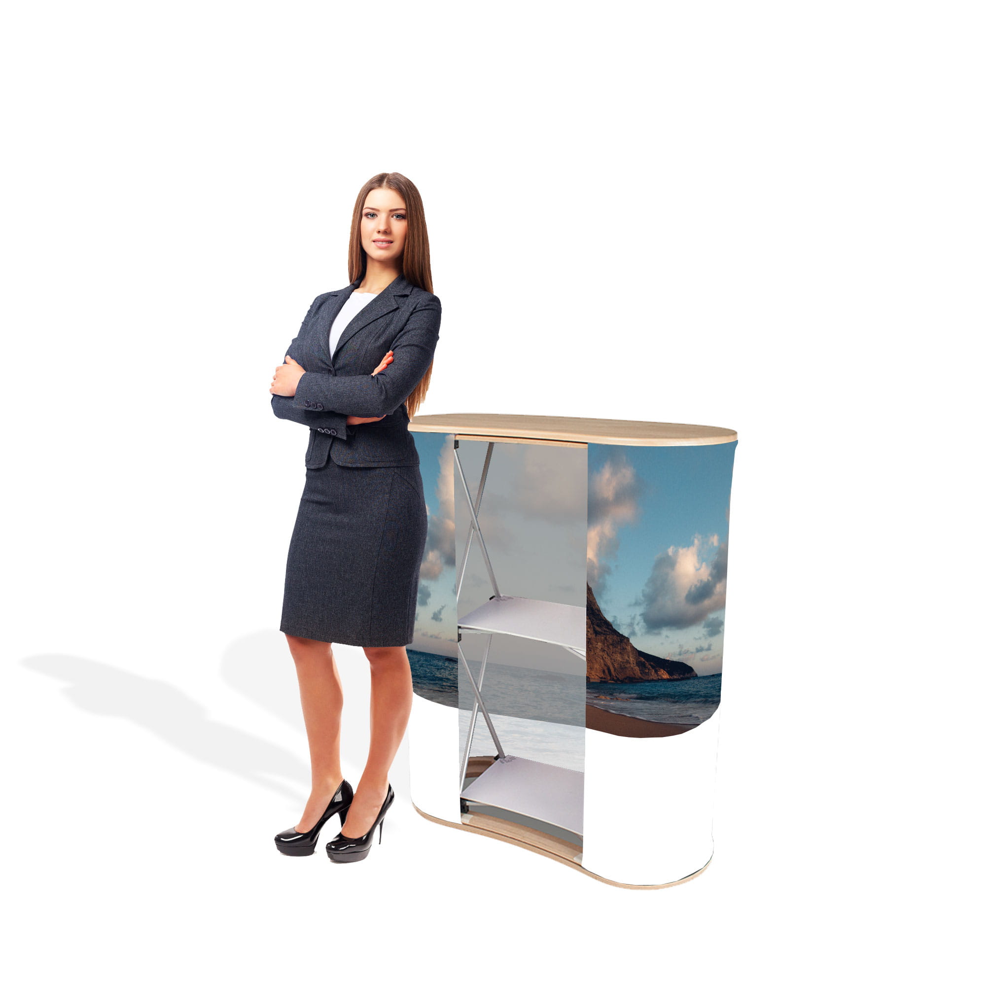 - The system has: pop-up frame, countertop, base, two shelves and textile graphics