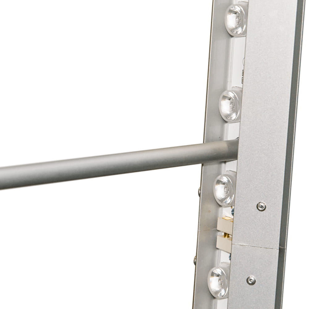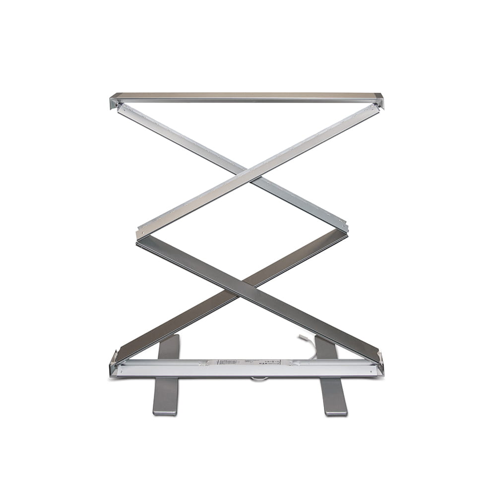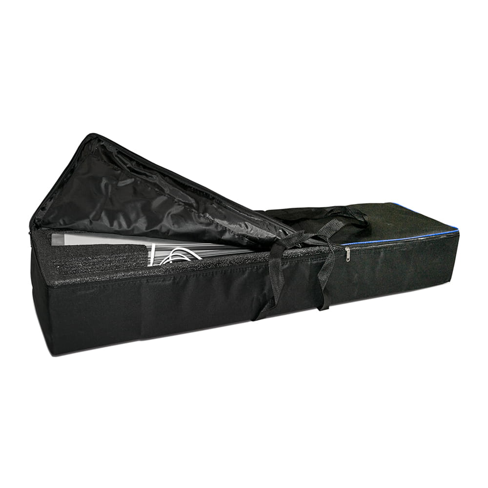 The FLEX lightbox is a double-sided, portable backlit system that can be assembled with one hand motion within seconds. The hinge-based construction requires no tools. The entire system is packed in a dedicated polyester transport bag.