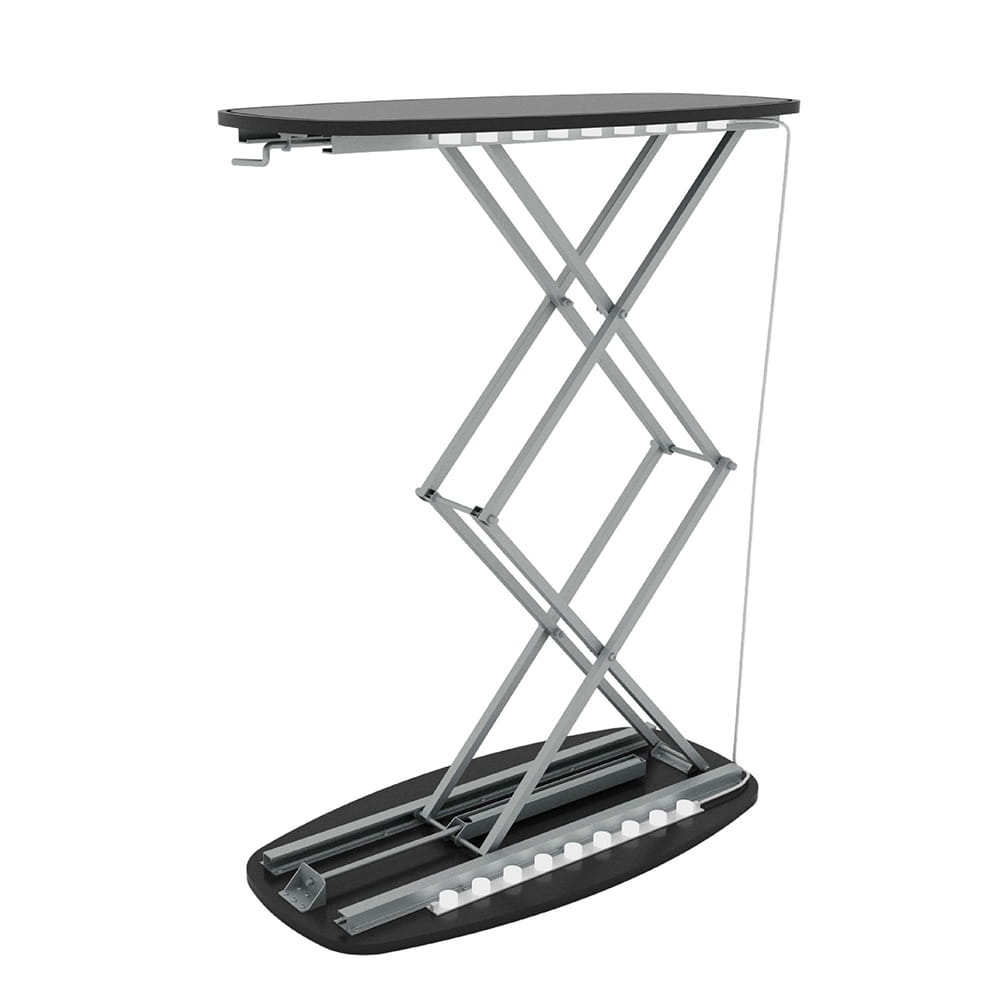 The frame features a steel scissor lift and an aluminum holder. The counter top is made from 15 mm thick black MDF board, additionally finished with a 3 mm diameter channel.