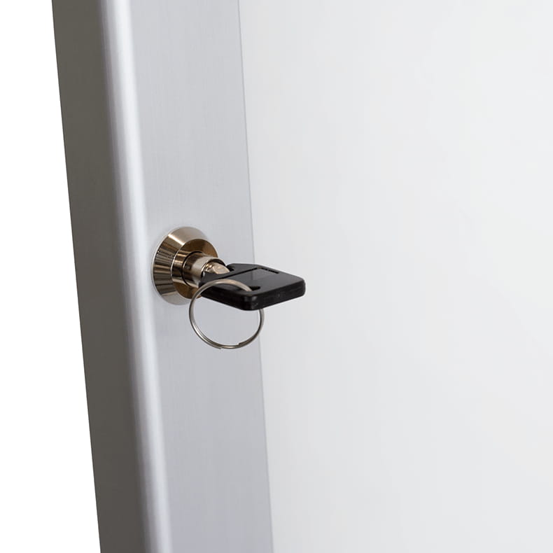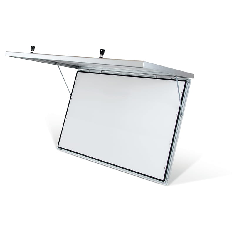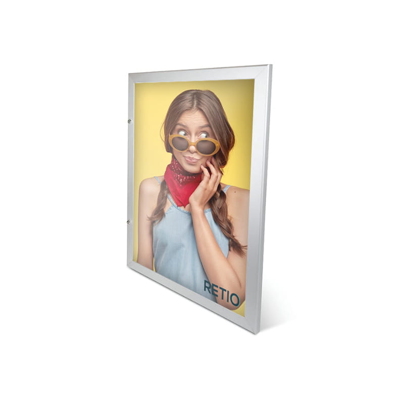 Sturdy frame in silver color, made of high-quality anodized aluminum, corrosion-resistant. The front face of the display case is equipped with a double lock that fully protects your contents against unauthorized access. A special watertight seal allows the display case to be used both inside and outside buildings.