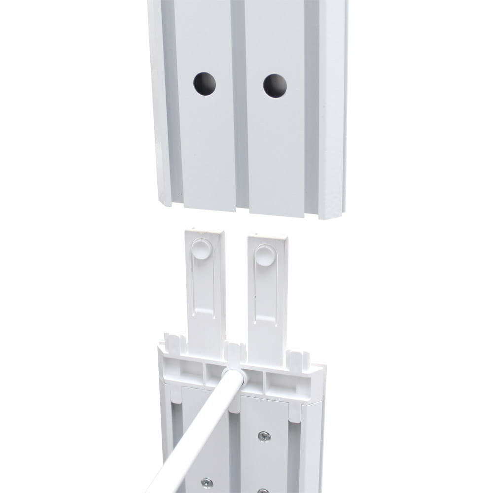 The basis of the stand of the stand are elegant, white aluminum profiles with a width of 100 mm, to which LED lighting is attached. The assembly system is freezing and intuitive , thanks to which the distribution of the coffered coffin, as well as its assembly, take only a few moments.It is equipped with two feet that ensures stability on the flat surface.