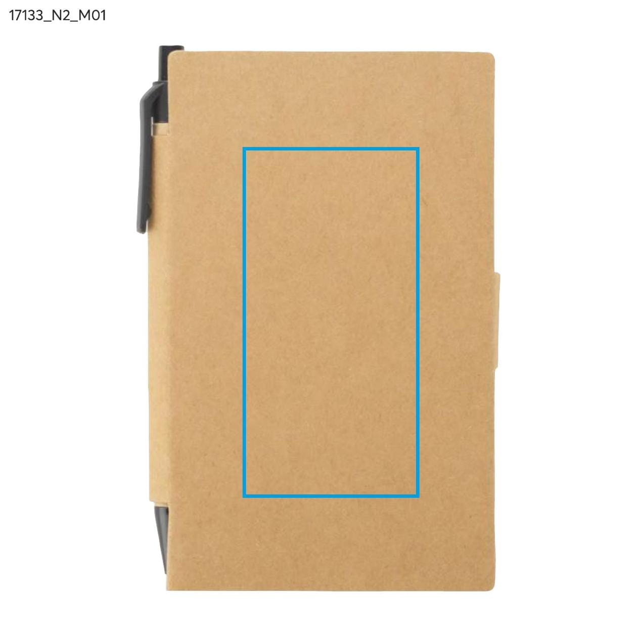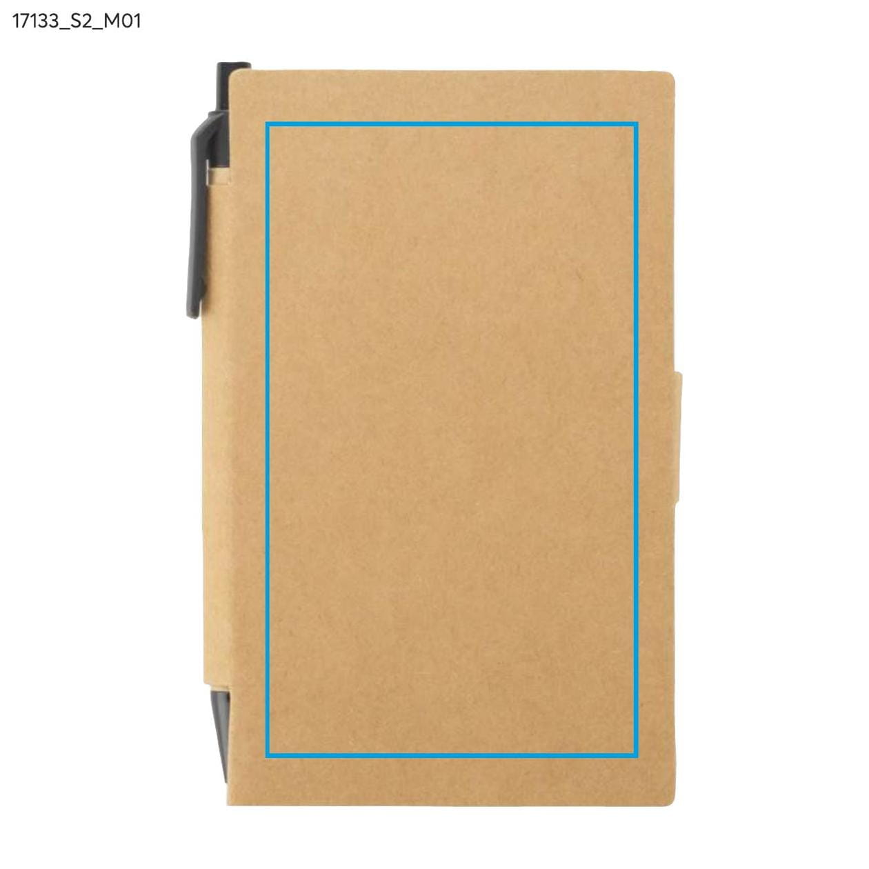 Notebook with memo notes and a pen. Notebook with a cardboard cover. Eco-friendly pen made of cardboard and recycled plastic. The logo on the notebook will be printed using pad printing technique. Pen with black refill.