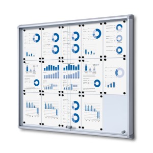 Display case with sliding doors is an excellent solution when space is limited. It is ideal, for example, in narrow corridors where a display case with traditional hinges might block passage during content replacement. The display case is lockable with a key, and the doors are made of safety tempered glass. The internal back panel is made of metal sheet, allowing the use of magnets and markers, which are also available in our store.