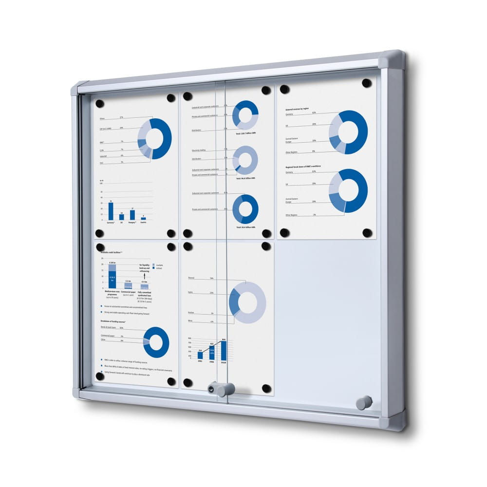 Display case with sliding doors is an excellent solution when available space is limited. It is ideal, for example, in narrow corridors where a display case with traditional hinges could block the passage during content changes. The display case is locked with a key and the doors are made of tempered safety glass. The inner back panel is made of metal sheet, allowing the use of magnets and markers, which are also available in our store.