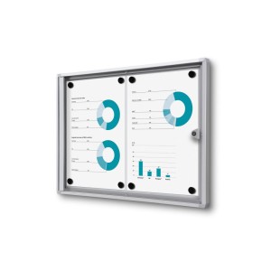 Lockable magnetic display case designed for indoor use, ideal for presenting information inside buildings. The back of the display case is made of sheet metal, allowing information to be attached with magnets and also written on with a dry-erase marker.