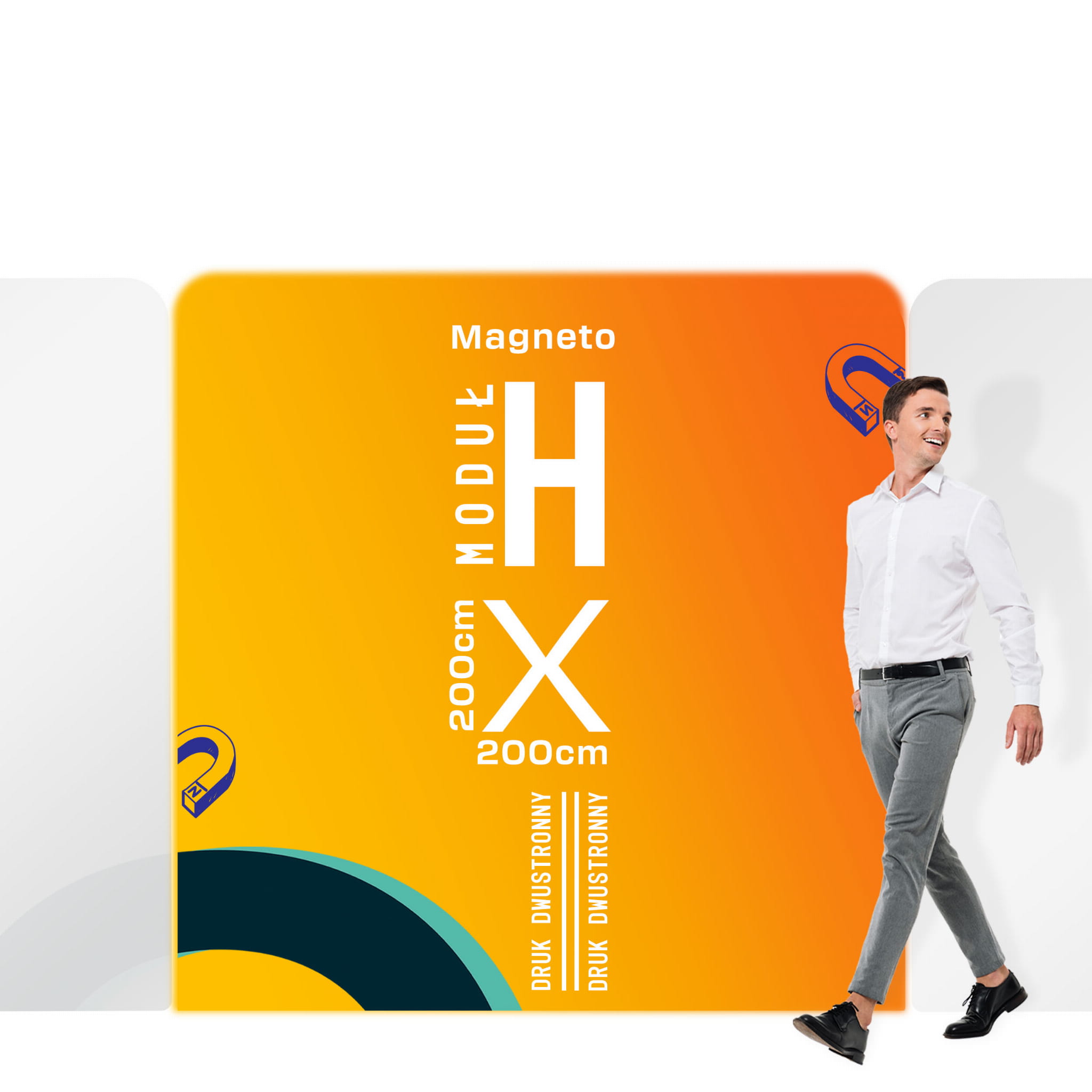 Magneto textile walls are a revolutionary solution in the world of trade show booths, allowing seamless connection and disconnection of individual booth modules. This is thanks to the use of strong magnets - four on each segment. When two such walls are placed together, they connect without the need for any tools whatsoever, enabling the assembly of a fully functional booth in various configurations in just a few moments. The possibilities are truly unlimited - we encourage you to check the gallery for inspiration.