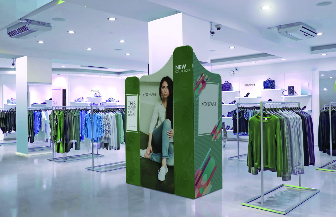 The print is made using sublimation technique on high-quality Display Stretch 180 g material, which features excellent color saturation. In this case, there are two layers of material joined together with a zipper, allowing the graphic to be perfectly stretched on the frame once pulled tight. The zipper is hidden under a cover, so it does not disrupt the booth's aesthetics.