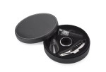 Elegant four-piece wine set packed in a box finished with eco-leather. The set includes: a vacuum wine stopper, a pourer with an aerator function, a corkscrew, and a bottle collar. The vacuum stopper with a pump that extracts air from the bottle allows for longer storage of opened wine without losing valuable aromas. The pourer with an aerator function aerates the wine, releasing its aromas.