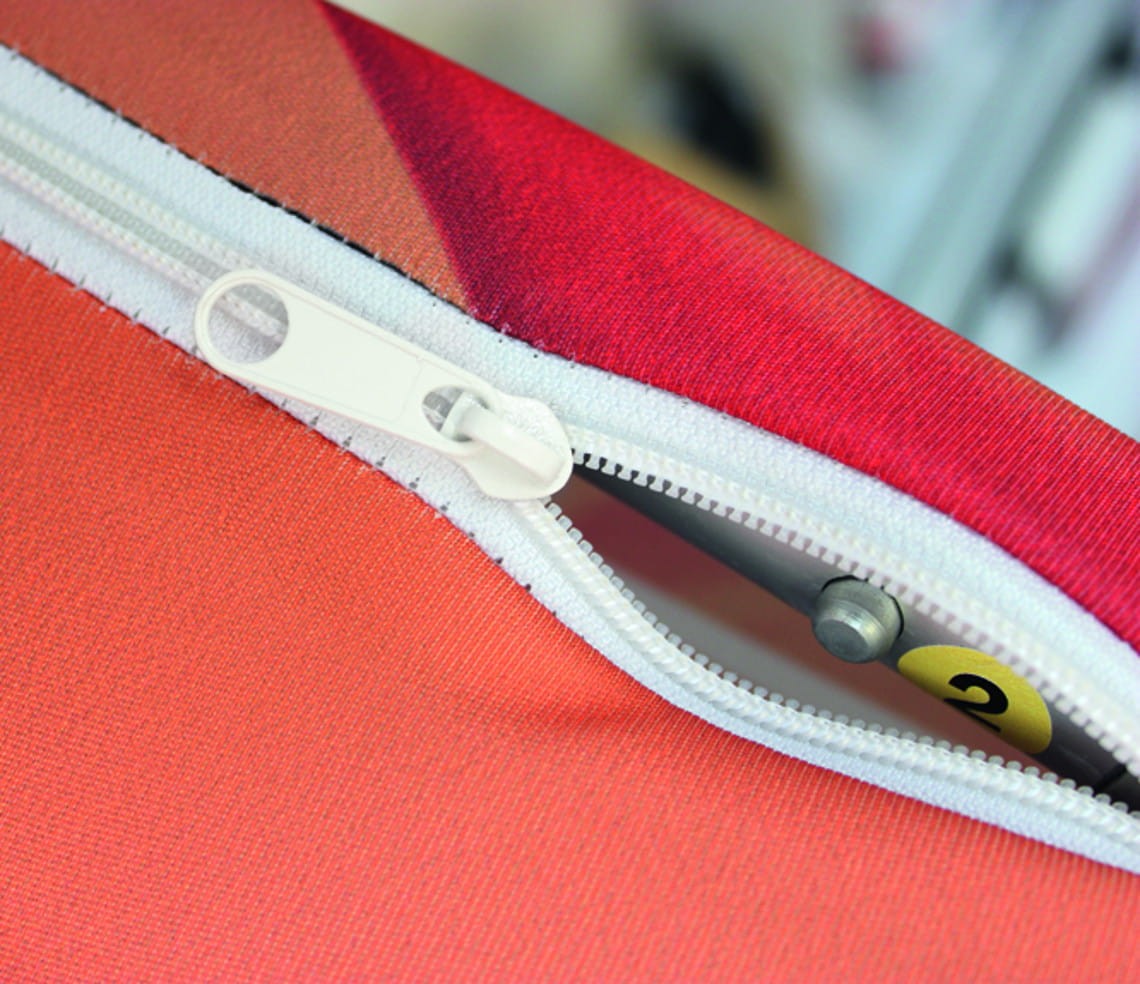 The material is finished in a way appropriate for a specific system.In the case of walls from aluminum tubes, we use two layers of material connected with the help of a zipper, for HOP -UP walls, it is Velcro heating, and for the Vector series - silicone trim.
