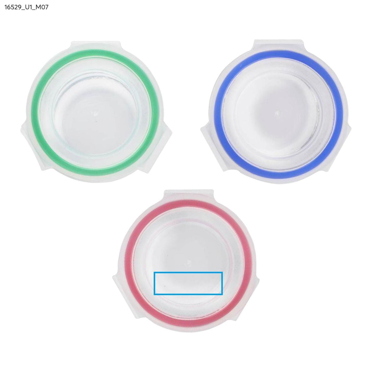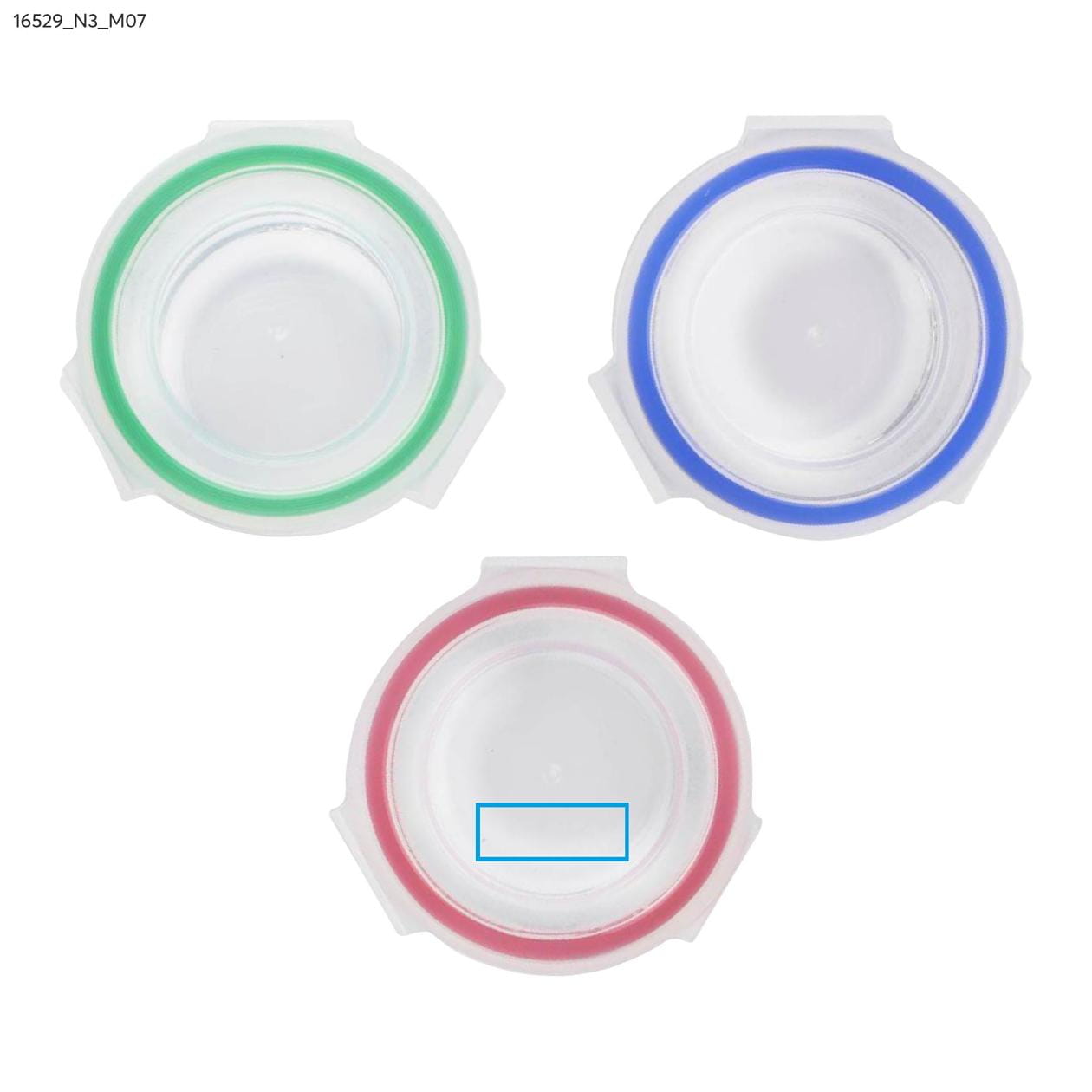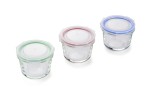 The PESTO set includes 3 borosilicate glass jars with transparent lids secured by 3 clasps. Each lid has a differently colored seal. They can be used for storing food and heating dishes at high temperatures. The capacity of one jar is 120 ml. The jars can be used in the dishwasher, oven, microwave, and freezer.