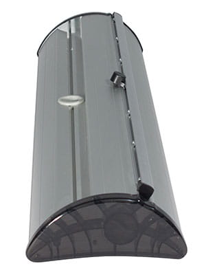 Barracuda is a single-sided roll-up. The graphic pulled out from the cassette is mounted using a hybrid telescopic mast, which can be adjusted as needed within the range of 1520 mm to 2130 mm. At the top of the graphic, there is of course a snap bar that prevents the banner from bending or sagging.