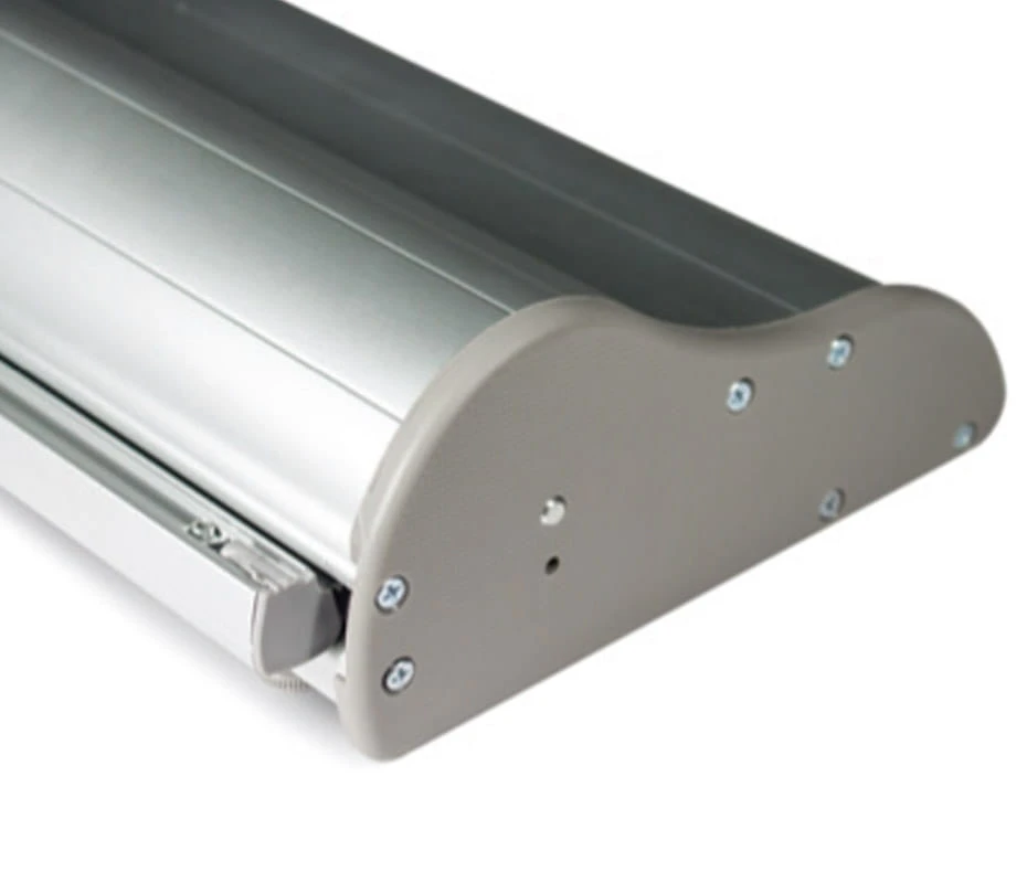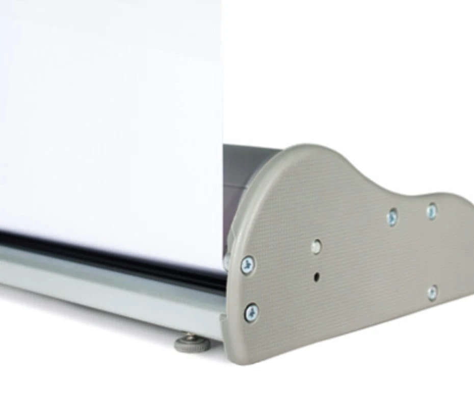 The Orient roll-up is a single-sided banner mounted in an elegant, flat cassette. In this case, the graphic is presented almost from the ground to hide the system. The adjustable feet of the Orient allow it to be displayed even on uneven surfaces.