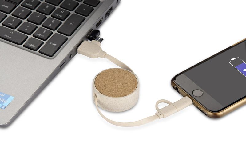 The SLOPI charging cable combines natural materials with functionality. Made from cork and wheat straw plastic, it offers USB, 2 x USB-C, and Lightning connectors, providing versatility and convenience. The retractable design makes storage easy, and the natural appearance gives it a unique character. Ideal as a practical promotional gadget.
