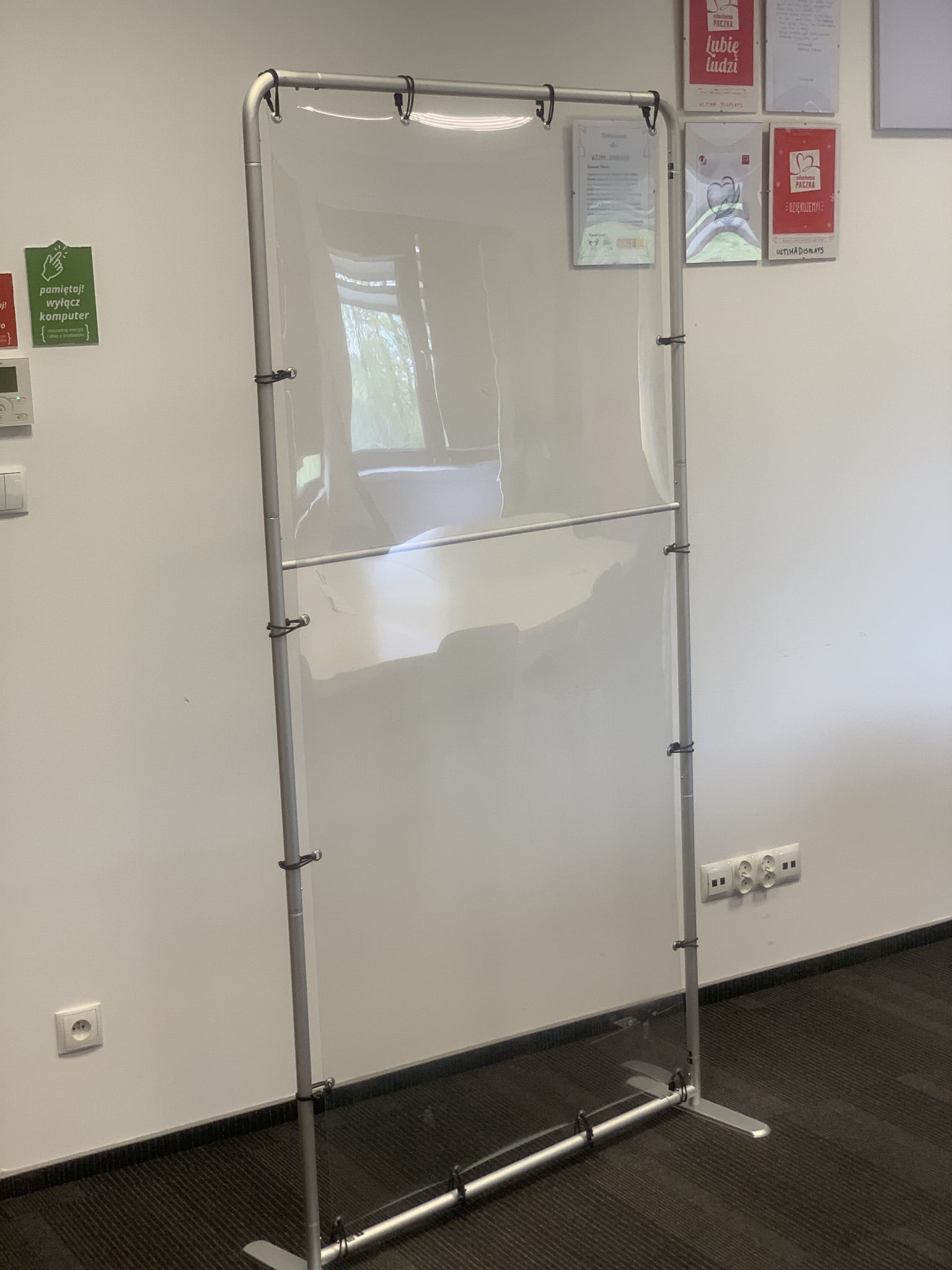 The protection was created by combining a structure and a 0.5 mm thick PET material. The mentioned structure is initially used as a stand or advertising panel, but by attaching a transparent PET plastic to this structure, the support can be transformed into a tall antiviral standing protection. Thanks to the use of a solid structure, there is no fear that the protective construction will be damaged, and since the PET material is a separate element, it can be replaced if needed without having to repurchase the entire support.