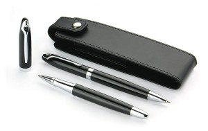 Elegant writing set consisting of a pen and a ballpoint pen. It is packed in a case made of PU eco-leather. We can engrave a logo on the writing instruments.