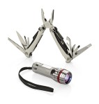 Gift set including a flashlight and a multifunction tool. The flashlight is equipped with a very bright diode, adjustable beam focus, and 3 lighting modes: high, low, and flashing. Each item is made of metal and the set is packaged in an elegant black box.
